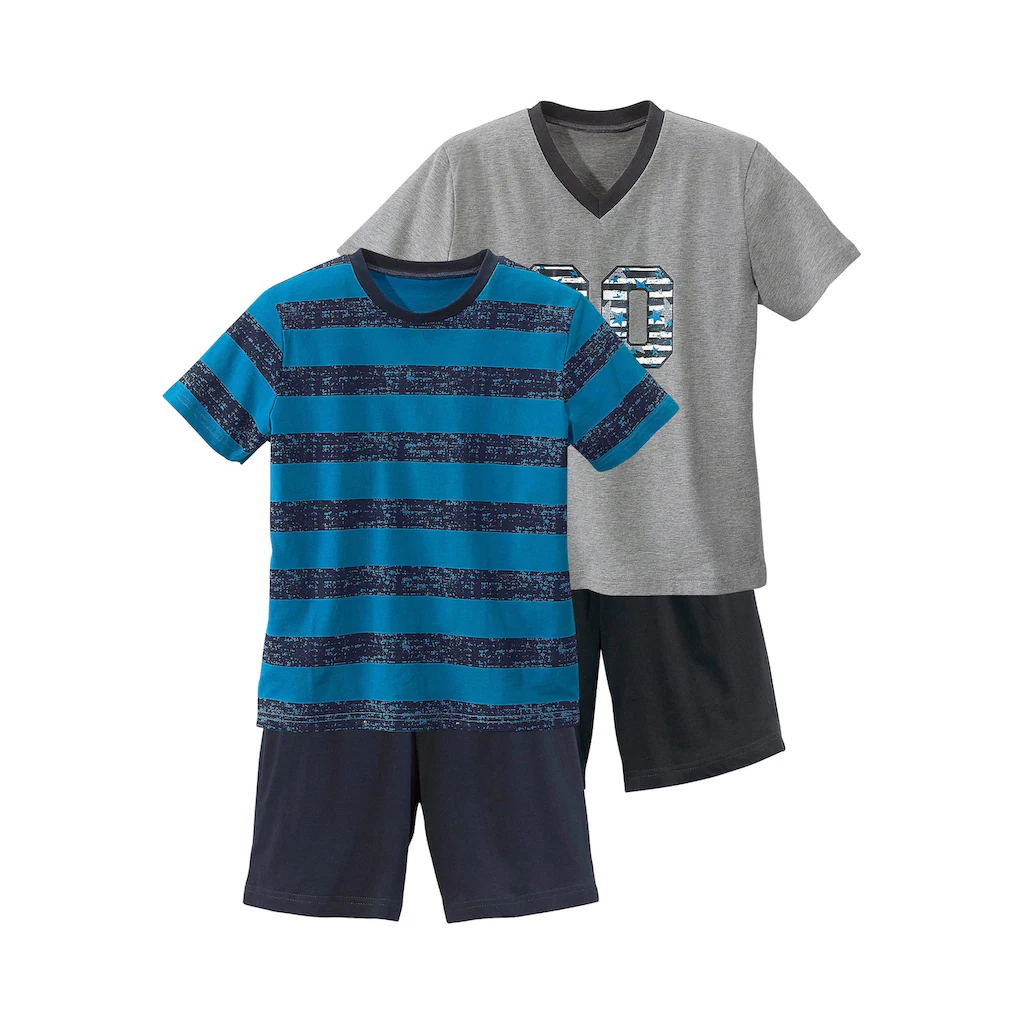 Kurz. Immer 1x mit V-Ausschnitt und Frontdruck und 1x Rundhalsausschnitt mit gedruckten Streifen in einer Packung. Hosen uni marine und uni schwarz mit elastischem Bund. Aus 100% Baumwolle.