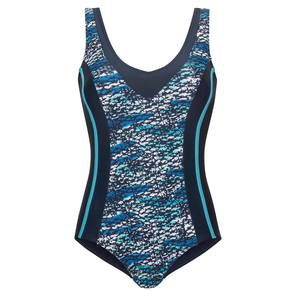 Modischer Frischekick! Badeanzug im fantasievollen Druck-Dessin. Einfarbige Akzente setzen die Blende am V-Ausschnitt und die optisch streckenden, seitlichen Einsätze mit Kontrastpaspel. Mit Vorderfutter, Soft-Cups und Unterbrustband. Rückenteil in Uni. Runder Rückenausschnitt. 80% Polyamid, 20% Elasthan. Futter: 85% Polyamid, 15% Elasthan.