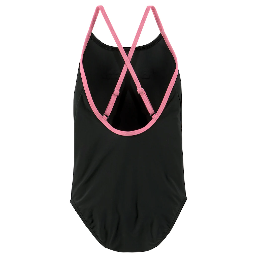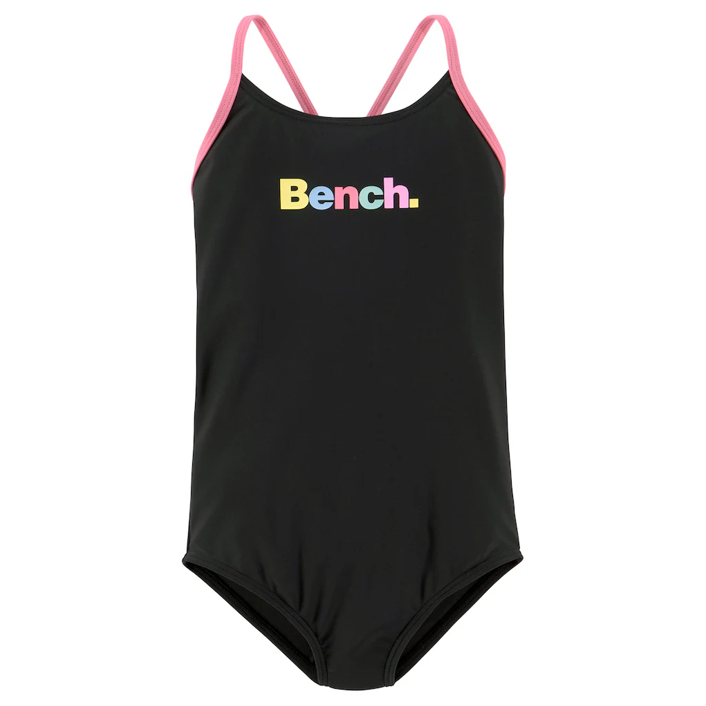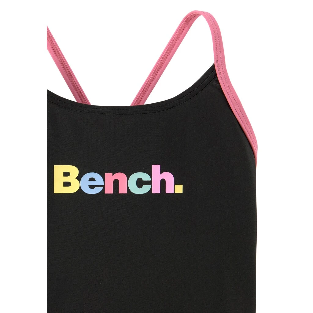 Modischer Badeanzug von Bench mit großem bunten Markenlogo vorn. Tiefer runder Rückenausschnitt. Verstellbare kontrastfarbene Träger, hinten gekreuzt. Weiche Microfaser auas recyceltem Polyamid.