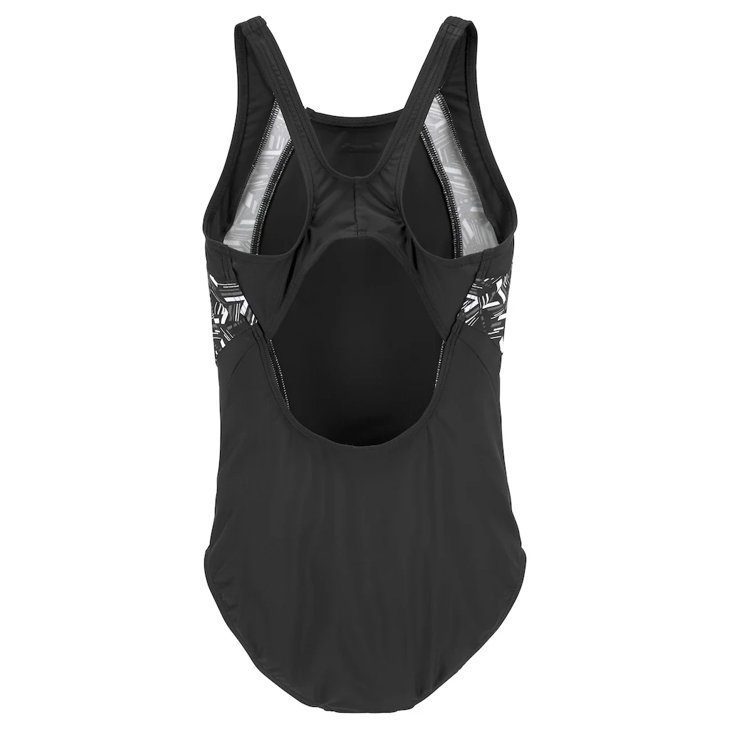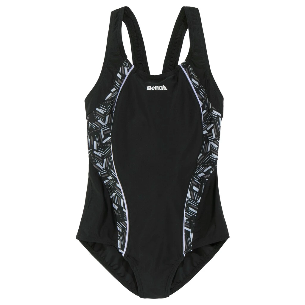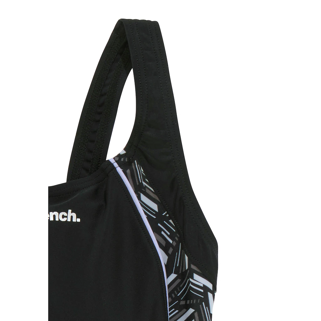 Badeanzug von Bench. In sportlicher Optik mit Ringerrücken. Bedruckte Einsätze im geometrischem Design. Aus recyceltem Polyamid. Obermaterial: 80% Polyamid, 20% Elasthan. Futter: 92% Polyester, 8% Elasthan