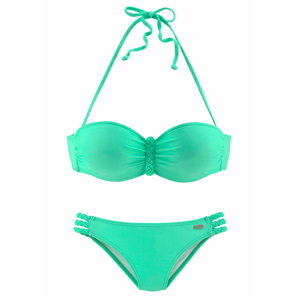 Bademoden von BUFFALO im neuen Trend-Look mit geflochtenen Details an den Abschlüssen. Bügel-Bandeau-Bikini mit modisch gerafften und wattierten Cups. Abnehmbare Träger und seitliche Stäbchen für einen perfekten Halt. Im Nacken zu binden und im Rücken zu schließen