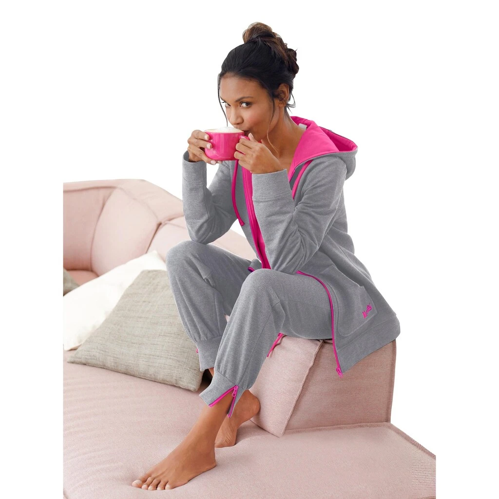 So bequem: Die Hose in angenehmer Sweat-Qualität sorgt für höchsten Komfort. Dehnbund mit Tunnelzug und Bindeband zur Weitenregulierung. Die Reißverschlüsse an den seitlichen Taschen und den elastischen Bündchen sind kontrastfarbig. Mit „feel good“-Stickerei. 60% Baumwolle, 40% Polyester.