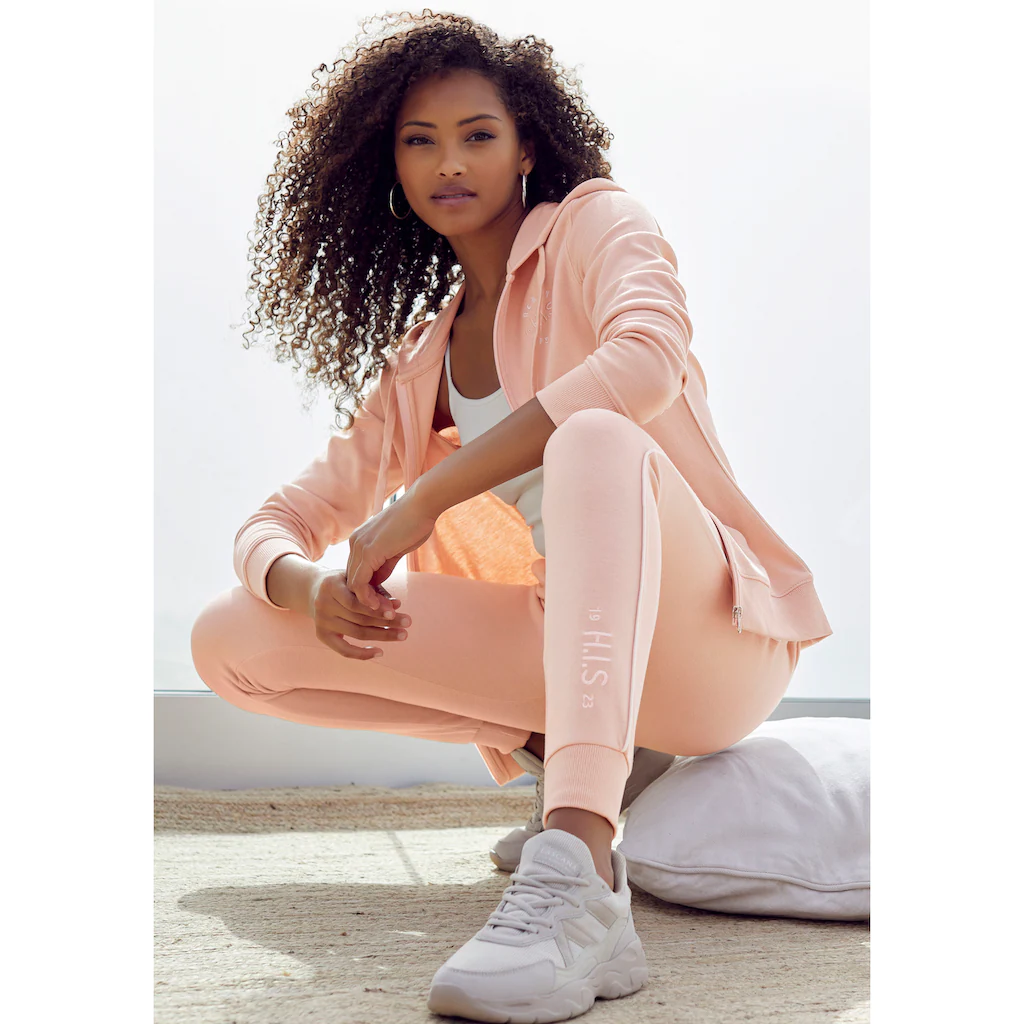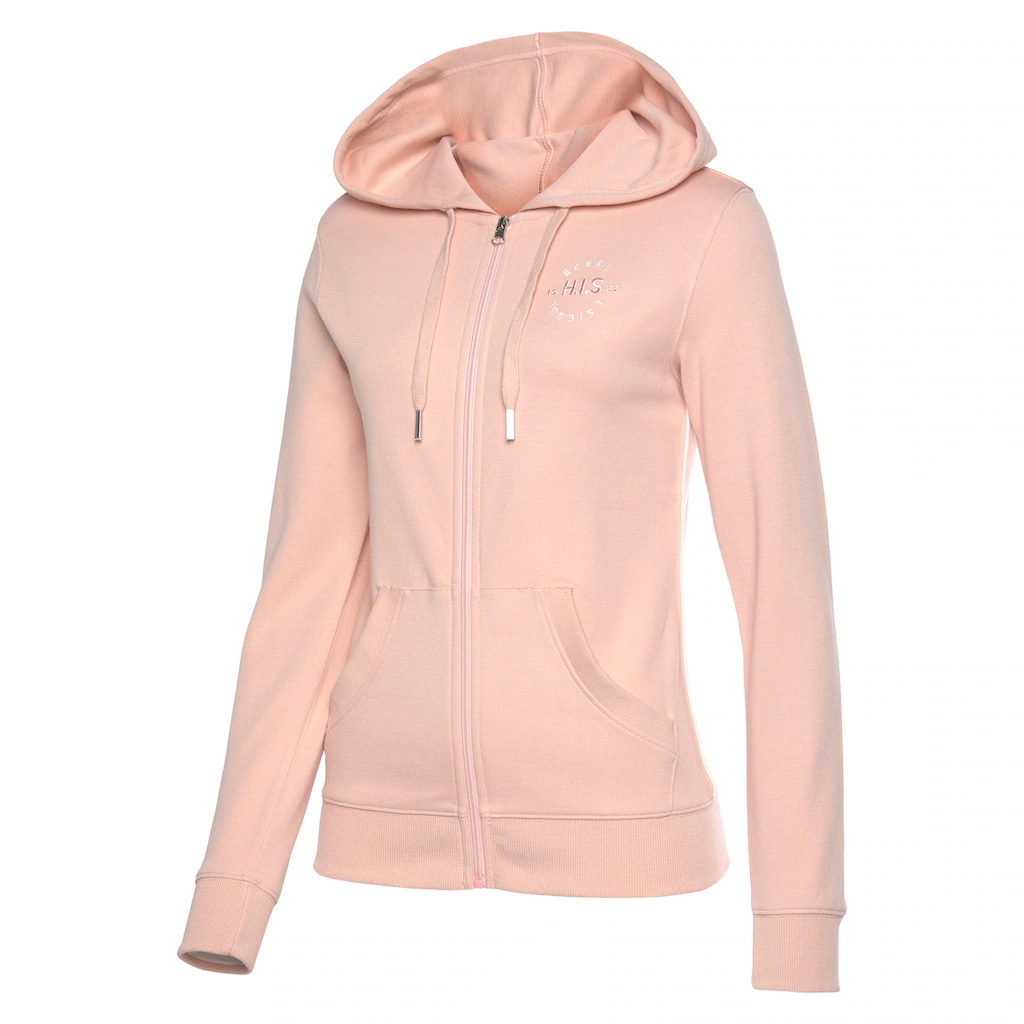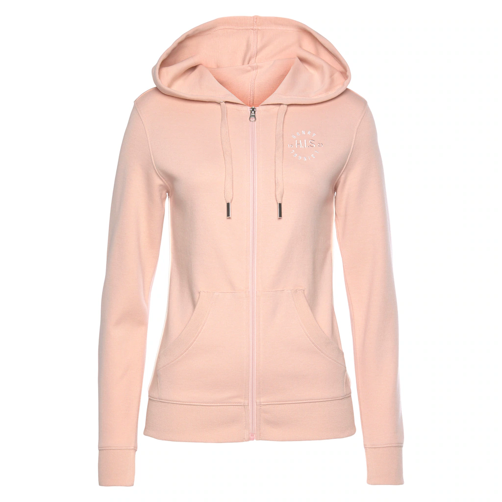 Kapuzensweatjacke von H.I.S. Kleine Logostickerei auf der Brust. Kontrastpaspeln seitlich. Geteilte Kängurutasche. Gerippte Bündchen. Kordelzug an der Kapuze. Elastische, weiche Interlockqualität.