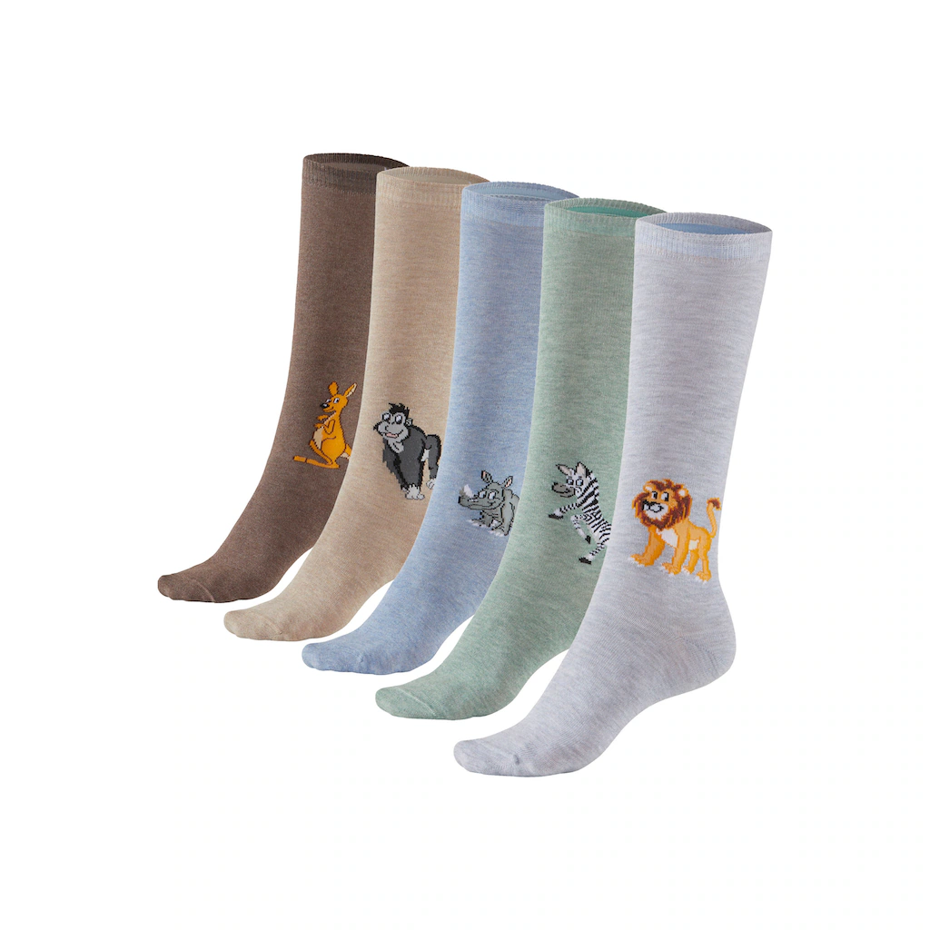 Mit unterschiedlichen Tiermotiven: Kinderkniestümpfe von H.I.S im 5er-Pack mit soften Rippbündchen gegen Einschneiden. Flache Naht an den Zehen verhindern Druckstellen. Komfortable Qualität aus Baumwolle mit Elasthan.