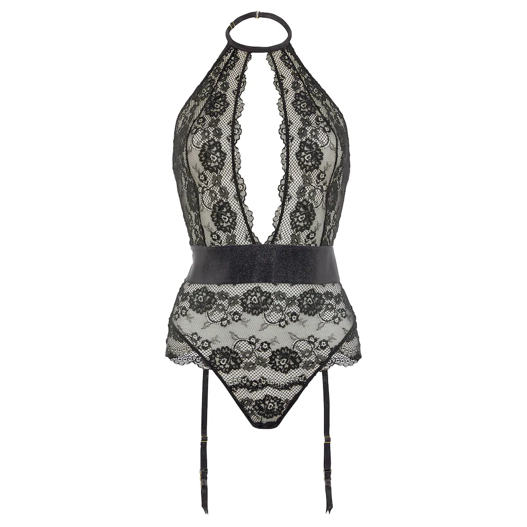 Body mit Neckholder von JETTE, kreiiert von der Designerin Jette Joop. Aus leicht transparenter, elastischer Spitze. Abnehmbare Strapse. Im Schritt aufhakbar mit Baumwollzwickel. Erotische Dessous. Reizvolle Dessous. Reizwäsche. Verführerische Dessous. Spitzen-Dessous. Romantische Dessous. Verspielte Dessous. Aus 89% Polyamid, 10% Elasthan, 1% Polyester