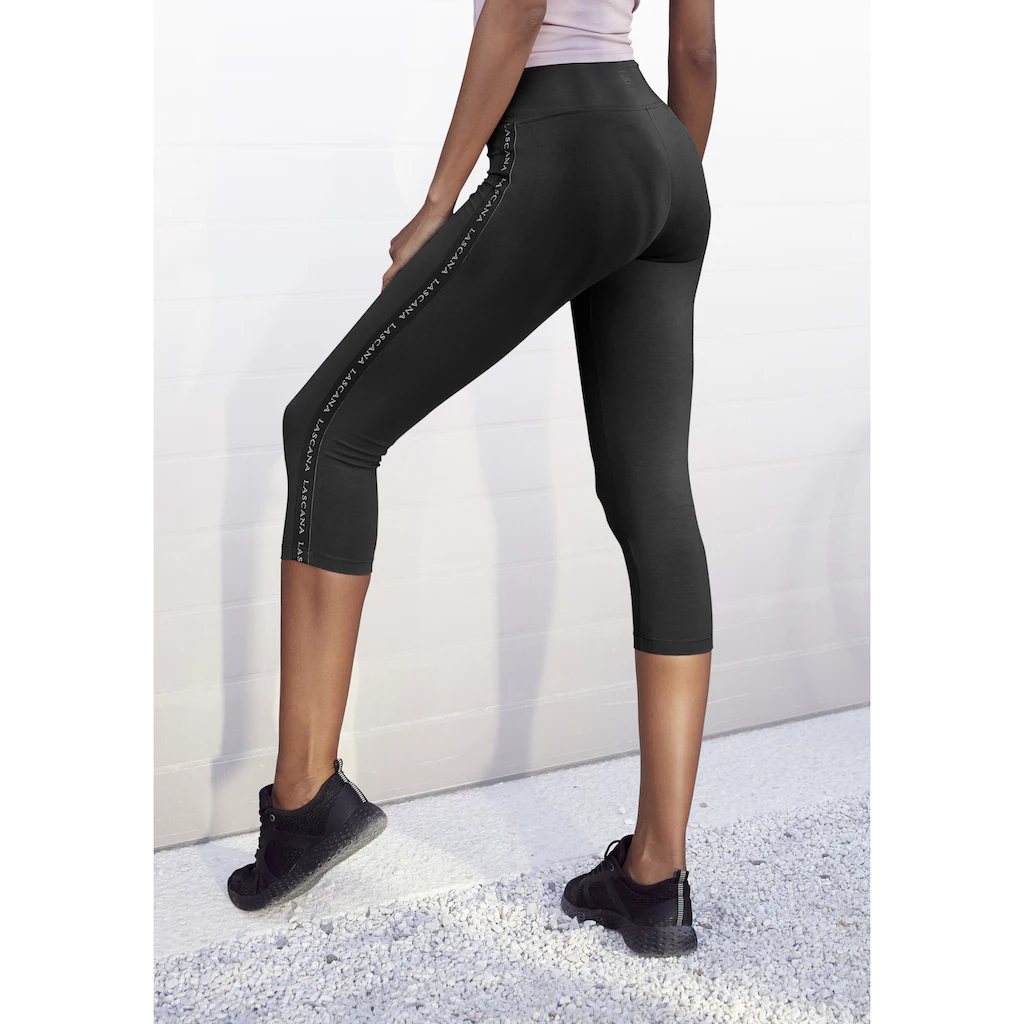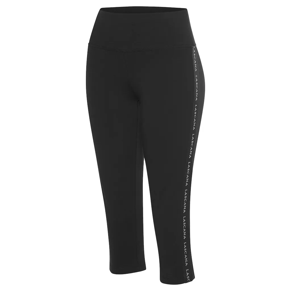 Performance Capri Leggings von Lascana Active. Breites Bündechen mit kleinem Logodruck hinten. Seitliches Logo Tape entlang der Beine. Aus 92% Baumwolle (unterstützt Cotton made in Africa), 8% Elasthan.