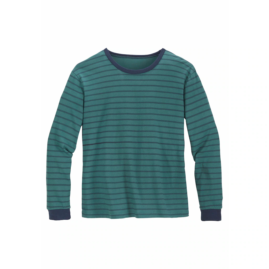 Pyjama für Jungen mit kontrastfarbigem Rundhalsausschnitt. Gestreiftes Oberteil und unifarbene Hose. Aus 100% Baumwolle.