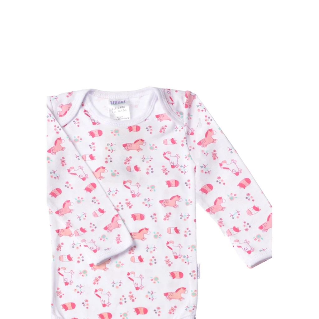 Dieser niedliche 2er-Pack Bodies besticht mit niedlichem Print mit Pferde- und Blumenmotiven. Ein Body des Doppelpacks ist mit einem Allover-Druck mit kleinen Pferden versehen. Der zweite Body trägt Blumen auf der Vorderseite. Im Schritt befinden sich jeweils drei Druckknöpfe für ein schnelleres Wickeln. Der besondere Ausschnitt sorgt mit seiner breiteren Öffnung für ein bequemes, leichteres An- und Ausziehen. Die Bodies bestehen aus reiner, hochwertiger Baumwolle und sind daher sehr weich und bieten einen angenehmen Tragekomfort auf der Haut.