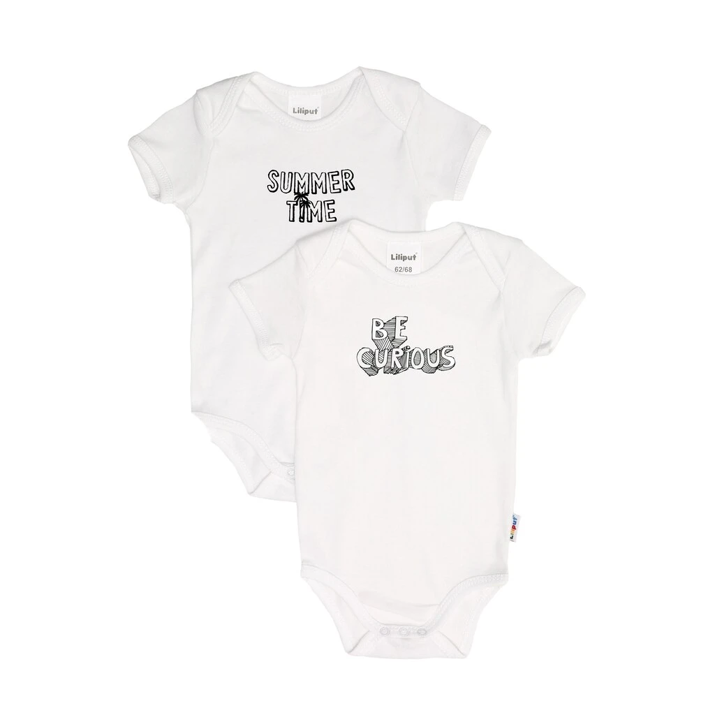 Das Set enthält zwei Kurzarm-Bodies in uni weiß mit aktuellen und süßen Drucken. Der praktische Druckknopfverschluss im Schritt macht das An- und Ausziehen sehr leicht – damit ist das Windelwechseln kein Problem mehr. Wie immer bei allen Liliput-Produkten überzeugt die hautfreundliche Qualität aus 100% Baumwolle.