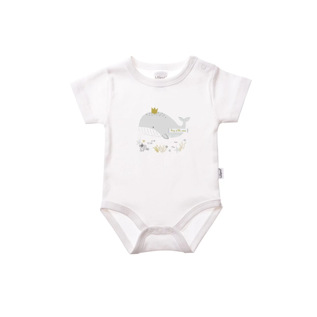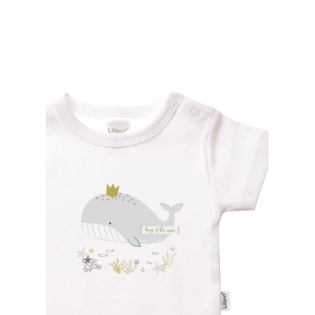 Dieser Kurzarmbody aus der neuen Shirtbody-Reihe von Liliput besticht durch den coolen T-Shirt-Look und einen extra großen Print auf der Vorderseite. Dieser Body trägt ein niedliches Meeresmotiv. Der Shirtbody ist mit insgesamt fünf Druckknöpfen ausgestattet, davon befinden sich zwei Druckknöpfe auf der Schulter und drei Druckknöpfe im Schritt, die das An- und Ausziehen erleichtern. Das Material besteht aus 100% Baumwolle und ist daher angenehm weich auf der Haut zu tragen.