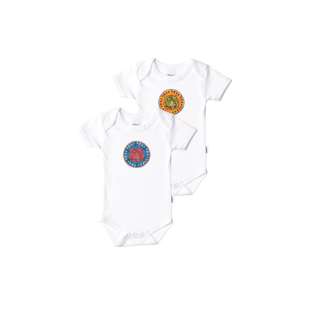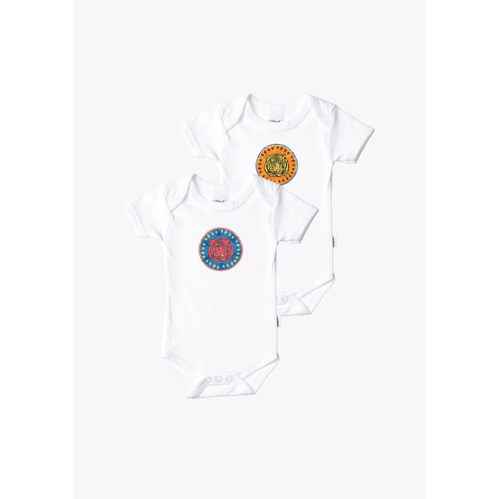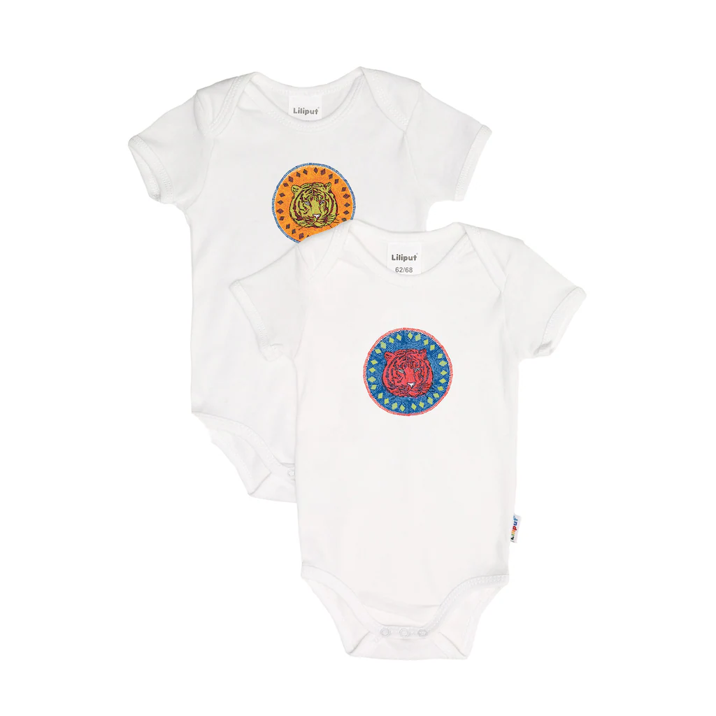 Das Set enthält zwei Kurzarm-Bodies mit niedlichem Tigerkopf-Print. Der praktische Druckknopfverschluss im Schritt macht das An- und Ausziehen sehr leicht – damit ist das Windelwechseln aus unterwegs kein Problem mehr. Wie immer bei allen Liliput-Produkten überzeugt die hautfreundliche Qualität aus 100 % Baumwolle. Die Bodies sind atmungsaktiv und schmiegen sich herrlich an die zarte Babyhaut.