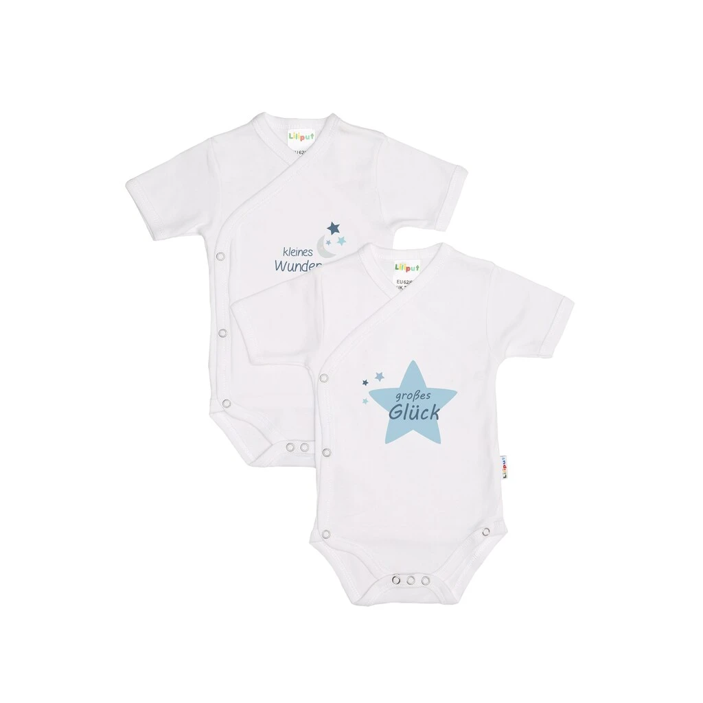 Dieses Set von Liliput enthält zwei Wickelbodies mit niedlichem Frontdruck und kurzem Arm. Die lange Druckknopfleiste macht das An- und Ausziehen sehr leicht. Wie immer bei allen Liliput-Produkten überzeugt die hautfreundliche Qualität aus weicher Baumwolle. Windelwechseln wird mit dem 2er-Pack leicht gemacht. Waschbar bis 40 Grad.