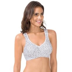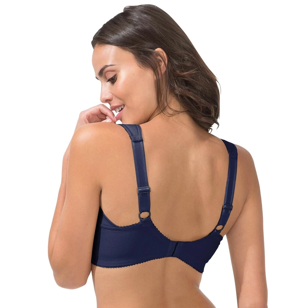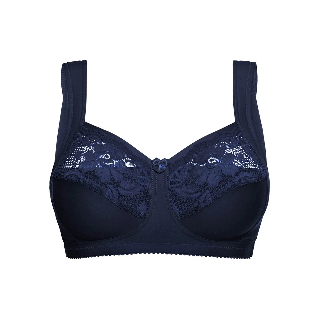 Bequemer Entlastungs-BH ohne Bügel von Miss Mary in weicher Baumwoll-Mischung. 2-geteilte Cups mit schöner, elastischer Spitzenverzierung. Die Stütze am Armausschnitt kaschiert seitliche Pölsterchen und erhöht den Komfort. Wattierte Seitenstütze und wattierte, im Rücken verstellbare Komfortträger. Rücken in bequemem, elastischem Material. 64% Baumwolle, 17% Polyamid, 13% Elasthan, 6% Polyester.