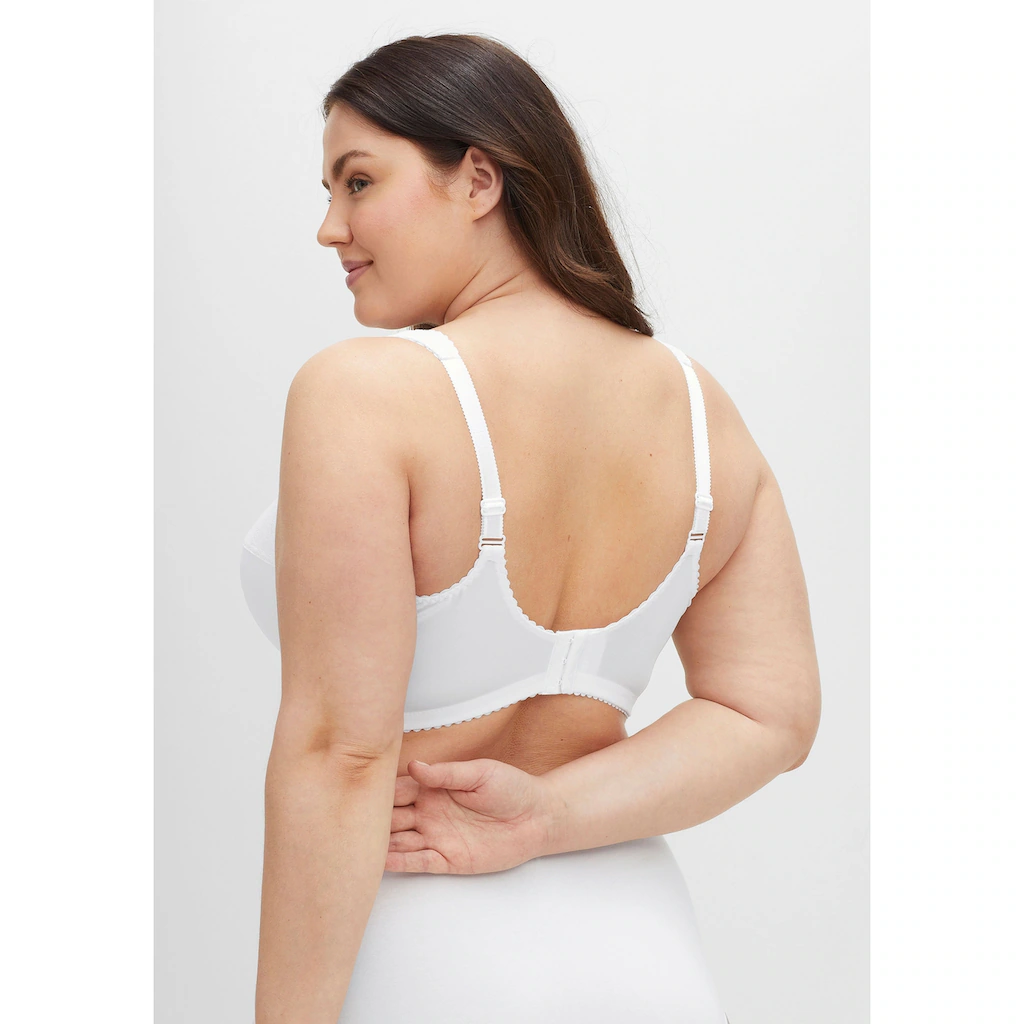Perfekter Halt, auch ohne Bügel: Ein komfortabler Entlastungs-BH von sheego, der in bezaubernd femininer Optik auch größere Oberweiten perfekt in Form bringt und die Brust optimal entlastet. Die zarte, leicht transparente Spitze oberhalb der Cups verläuft bis in die verstellbaren Träger. Die gut abdeckende Schnittform der Cups sowie die breiten, verstellbaren Träger stützen die Brust optimal und geben perfekten Halt. Auch der wattierte Rückenverschluss ist individuell verstellbar. Komfortabel, bequem und modisch!