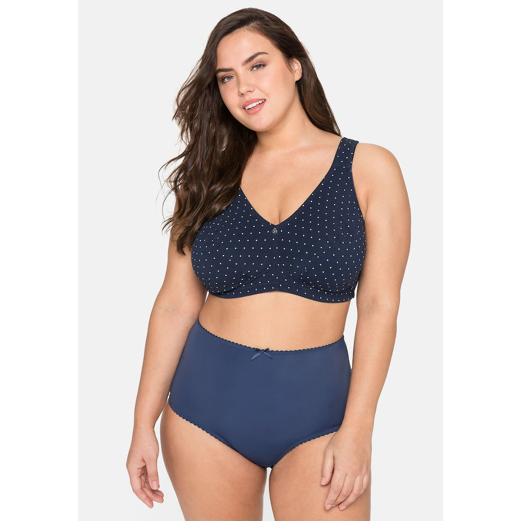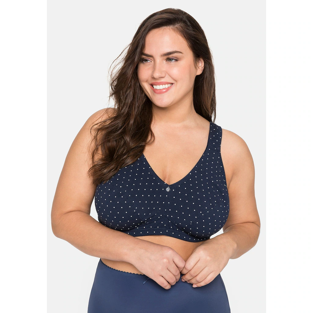 BH ohne Bügel im Doppelpack von sheego, 1 x unifarben und 1 x gepunktet. Breitere, wattierte Träger schneiden nicht ein, das breite Unterbrustband stützt die Brust. Auch die abdeckende Schnittform gibt zuverlässigen Halt und Komfort. Weitere praktische Eigenschaften sind die verstellbaren Träger sowie der verstellbare Rückenverschluss.