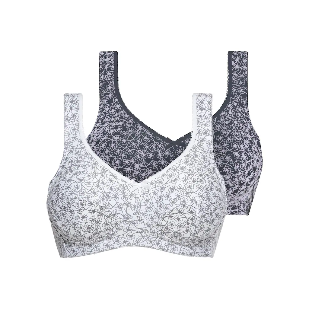 2 Farben in 1 Packung: perfekt sitzender BH ohne Bügel von Susa. Die 3-geteilten Cups schmücken ein modisches Blumenmuster und ein Zierschleifchen. Im Rücken verstellbare Komfortträger. 93% Baumwolle, 5% Polyamid, 2% Elasthan.