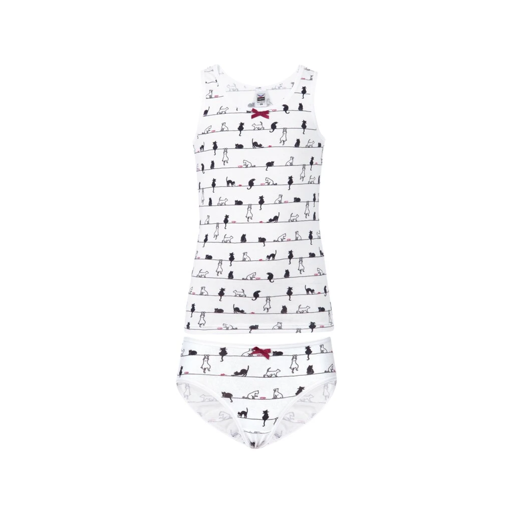Schicke Wäsche für drunter ist mit dieser Mädchen Unterwäsche mit Katzenmotiv ein Volltreffer. Die elastische Qualität aus Baumwolle und Elastan ist formtreu und hautsympathisch, ein echter Hautschmeichler. Passend zum Mädchen Unterhemd gehört auch ein Unterhöschen mit Katzenmotiv dazu. Für eine optimale Passform sind bei dem Mädchen Unterhemd Rundhals- und Armausschnitte sowie bei der Mädchen Unterhose Bund und Beinausschnitte elastisch, mit Glanzgummi eingefasst. Eine süße Schleife am Halsausschnitt und am Bund der Unterhose verpassen der Mädchen Unterwäsche darüber hinaus einen charmanten Look.Bundverarbeitung: ElastikbundBügeln: mäßig heiß bügelnHerkunftsland: DeutschlandMaterialbezeichnung: Baumwolle/KunstfaserMaterialzusammensetzung: 95 % Baumwolle, Ringgarn supergekämmt, 5 % ElastanSchnittform: Mädchen-SchnittTrocknen: SchontrocknenWaschen: Normalwaschgang 60°webcatchline: TRIGEMA Inh. W. Grupp e.K. ist Deutschlands größter Hersteller von Sport- und Freizeitkleidung, produziert ausschließlich in drei Werken auf der schwäbischen Alb und ist damit zu 100% Made in Germany.Ärmeltyp: Ärmellos