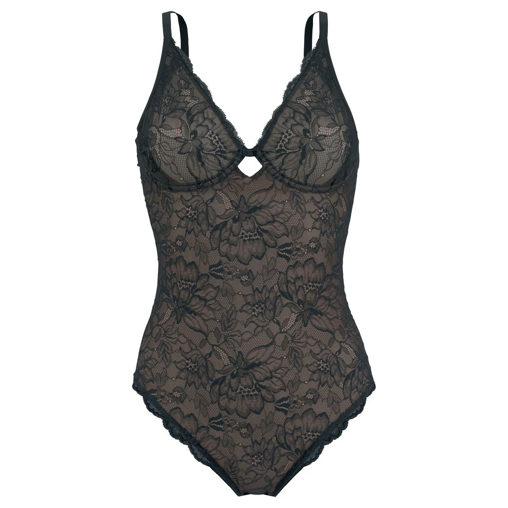 Femininer Body mit eingearbeiteten Formbügeln. Rundherum aus dezent transparenter Spitze in blumiger Optik. Formt eine tolle Silhouette. Mit eingearbeitetem Baumwollzwickel. Mit individuell verstellbaren Trägern. Obermaterial: 73% Polyamid, 27% Elasthan.