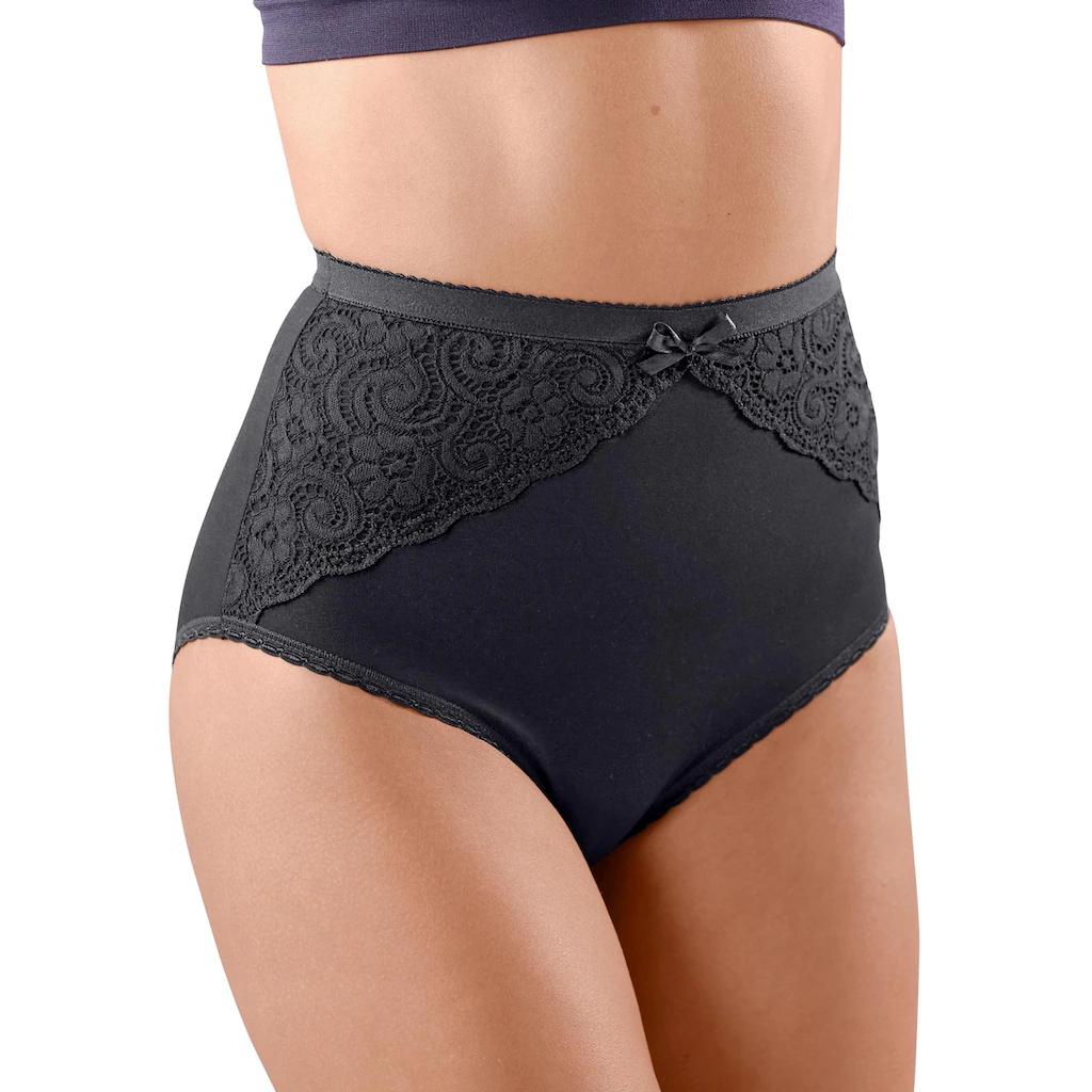 Eleganter Taillenslip von wäschepur in der praktischen 3-Stück-Packung. Mit edlem Spitzen-Einsatz vorne und süßem Deko-Schleifchen. Elastische Bund- und Beinabschlüsse und Baumwollzwickel. Single-Jersey-Qualität. 95% Baumwolle (OCS), 5% Elasthan.